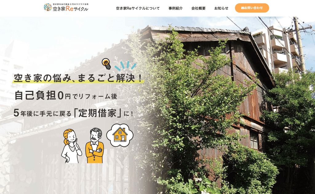 空き家Reサイクルは、空き家を保有しているけれど、管理に困っているオーナーさまより、空き家を借り受け、無料でリフォームを行い、定期借家として活用するサービスです。家は住まないと傷むもの、オーナーさまは草刈りなどの管理からも開放され、しかも家賃を受け取ることもできます。